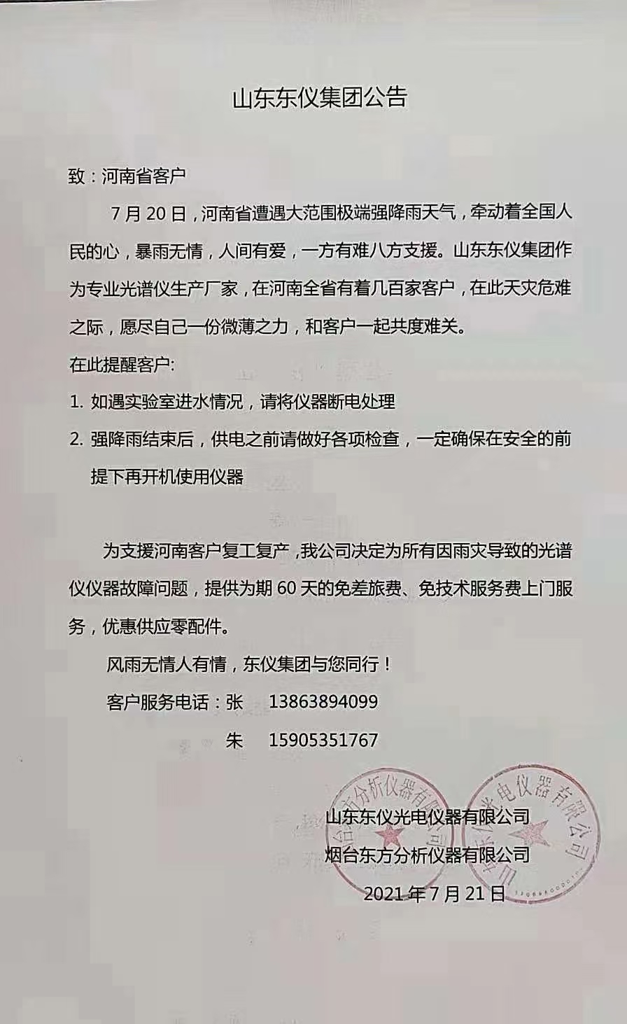 暴雨无情,人间有爱,一方有难八方支援。山东东仪集团作为专业光谱仪生产厂家,在此天灾危难之际,愿尽自己一份微薄之力,和客户一起共度难关。