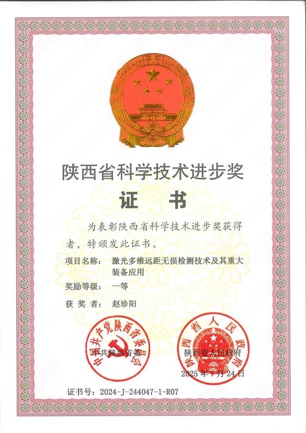 近日, 2025 年度陕西省科学技术进步奖评选结果揭晓,山东东仪光电仪器有限公司 及 核心 技术 参与者赵珍阳凭借 “激光多维远距无损检测技术及其重大装备应用”项目,斩获一等奖,获中共陕西省委、陕西省人民政府联合表彰(证书号:2024-J-244047-1-D03/ R07)。